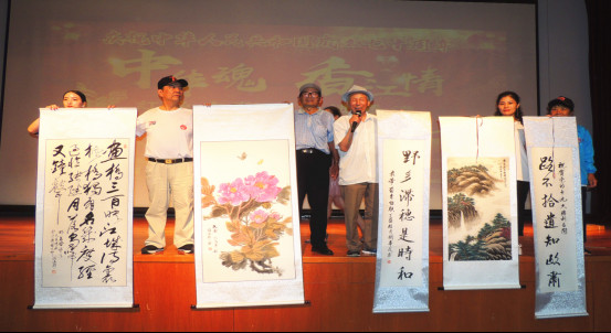演出期间,世界华人书画家副主席王洪海先生题写“中华魂 香江情”书法一副赠送给组委会,宜兴市张渚镇红十字会常务副会长、中国好人、80岁贾林康老先生为本次活动特别纪念品紫砂壶赠送组委会。