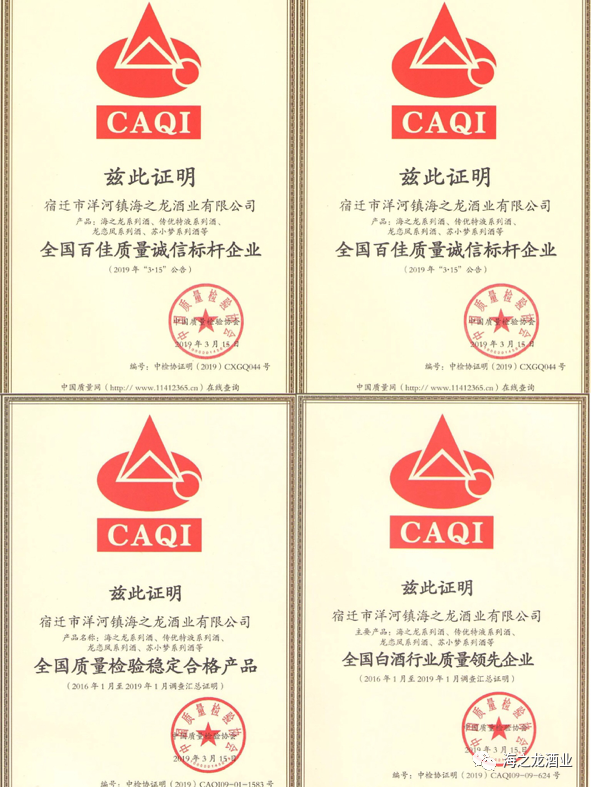 苏小梦系列酒获得中国质量检验协会颁发的“全国质量检验稳定合格产品”等荣誉证书