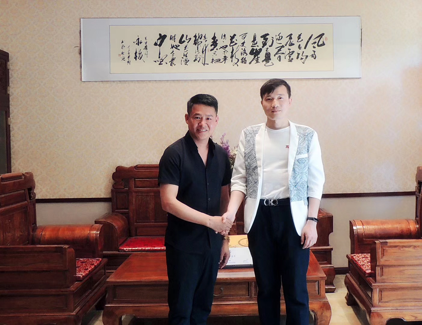 时间:2019-10-12 14:49:10 作者 :管理员近日,中国酒文化研究委员会秘书长、世界华人书画家协会副秘书长、香港华人杂志社新闻部副主任、海之龙酒业有限公司董事长黄曙光一行在著名青年作家单浩东先生的陪同下,应邀到北京中海.安德鲁斯庄园拜访李连杰金牌首席替身卢彦西先生,受到卢彦西先生热情的接待。双方就文化产业、影视、书画艺术、大健康、大平台、金融、爱心慈善、健康公益行等达成诸多共识。